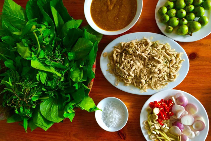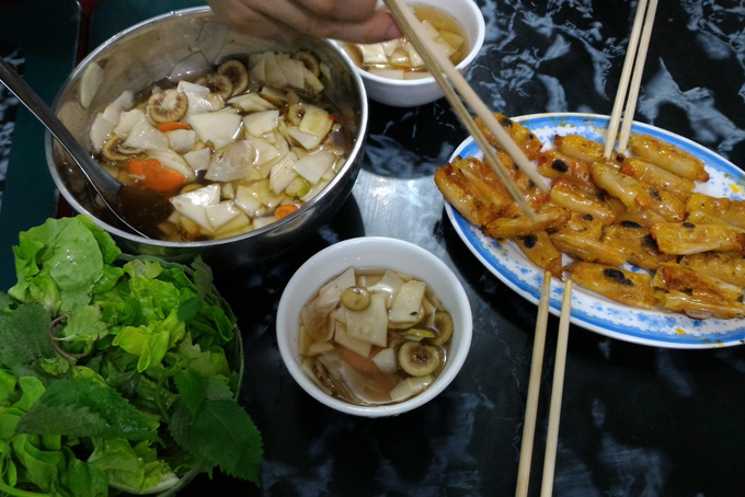 Khi chả tôm chín, thực khách ăn kèm cùng rau sống và nước chấm tỏi ớt chua ngọt có sung, đu đủ xanh thái lát để hương vị thêm trọn vẹn mà ăn nhiều vẫn không bị ngấy.